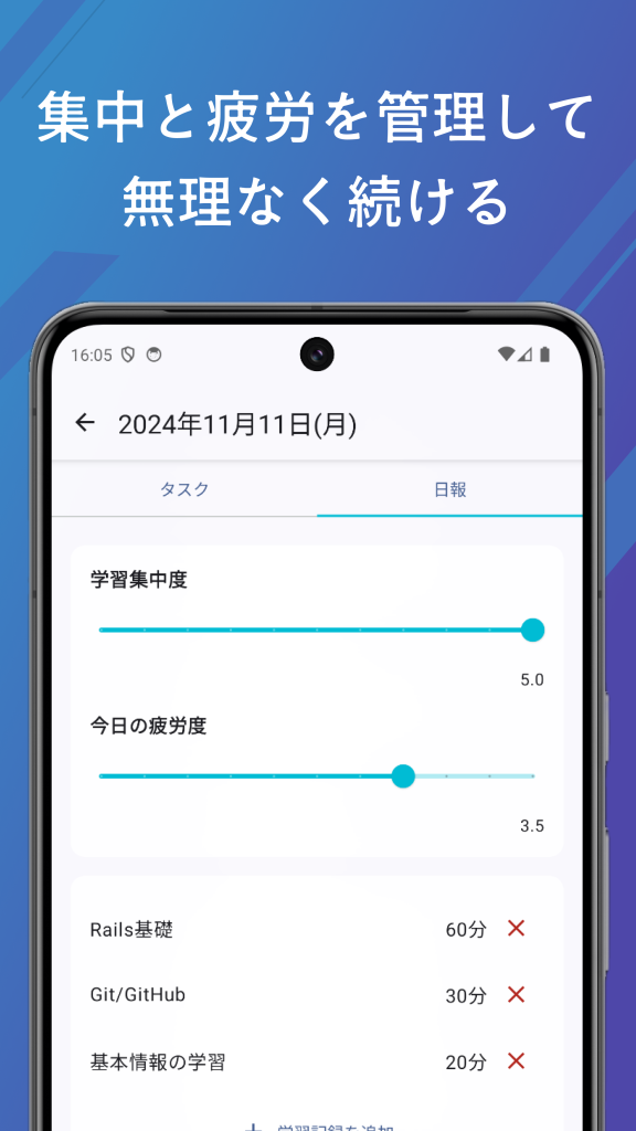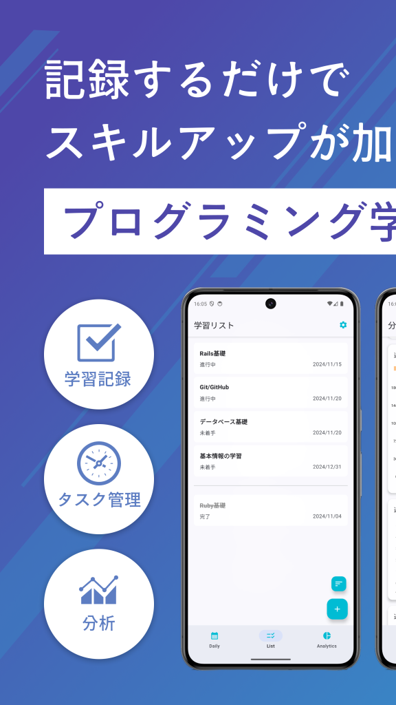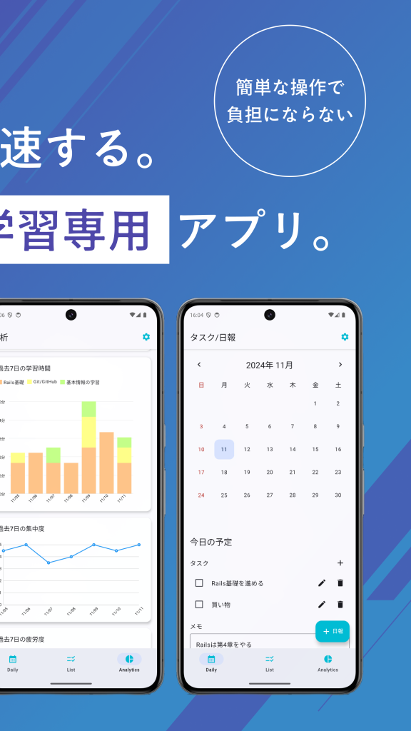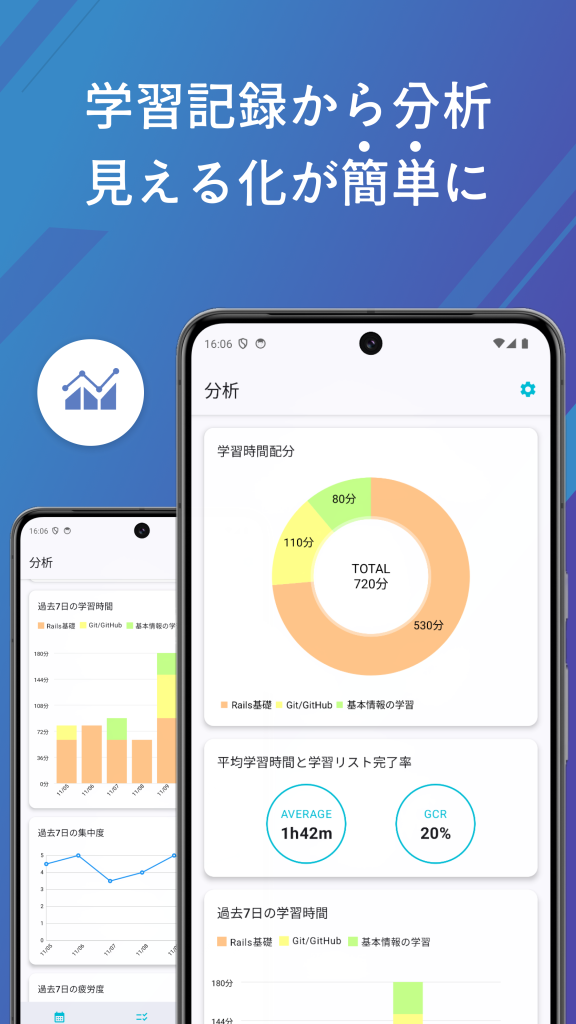 学びたい科目を登録し、学習の記録をグラフなどに表し可視化します